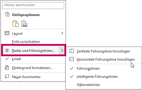 In PowerPoint sind Führungslinien visuelle Hilfslinien, die Ihnen helfen, sich im Layoutraster zu bewegen und Objekte präzise auf einer Folie auszurichten. Sie dienen ausschließlich der Gestaltung und sind weder in der Bildschirmpräsentation sichtbar noch werden sie gedruckt.