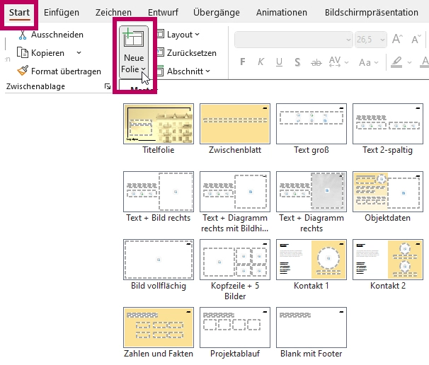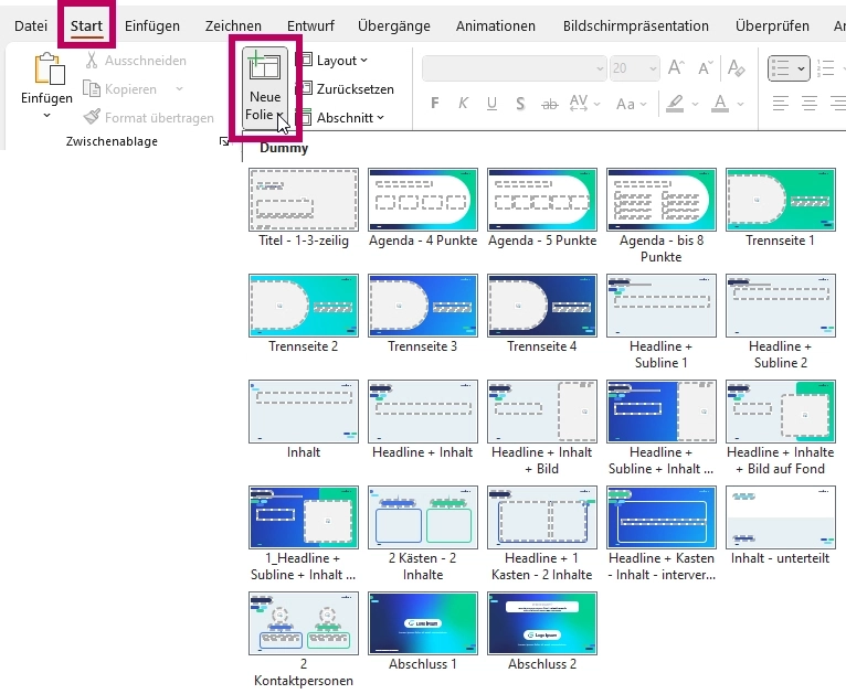 Neue Layouts können über Start > Neue Folie (siehe Screenshot oben) eingefügt und die Platzhalter entsprechend befüllt werden.