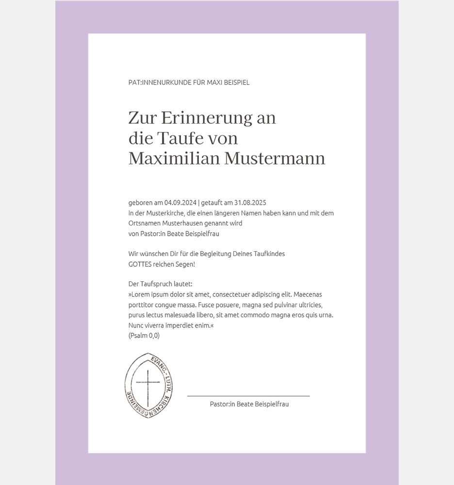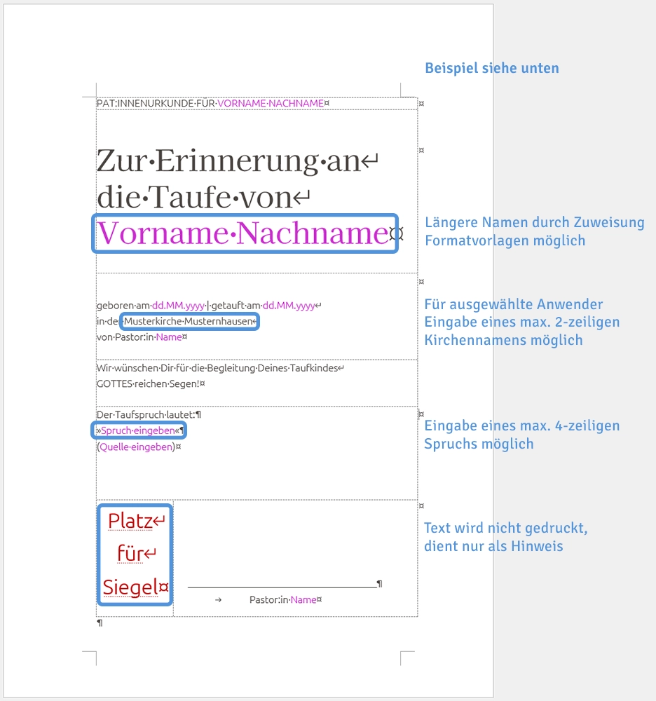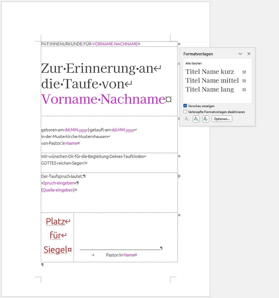 Für eine Kirchengemeinde erstellte eine Grafikerin ein ästhetisches Urkunden-Layout zu verschiedenen Anlässen. Meine Aufgabe war, dieses Layout aus InDesign in Word-Vorlagen für Urkunden zu übertragen – und zwar so, dass nur die variablen Daten ausfüllbar sind. Es sollte verhindert werden, dass Texte bewusst oder unbewusst verändert bzw. verschoben werden. Der Druck aus Word erfolgte auf Urkunden-Papier mit vorgedrucktem Passepartout.