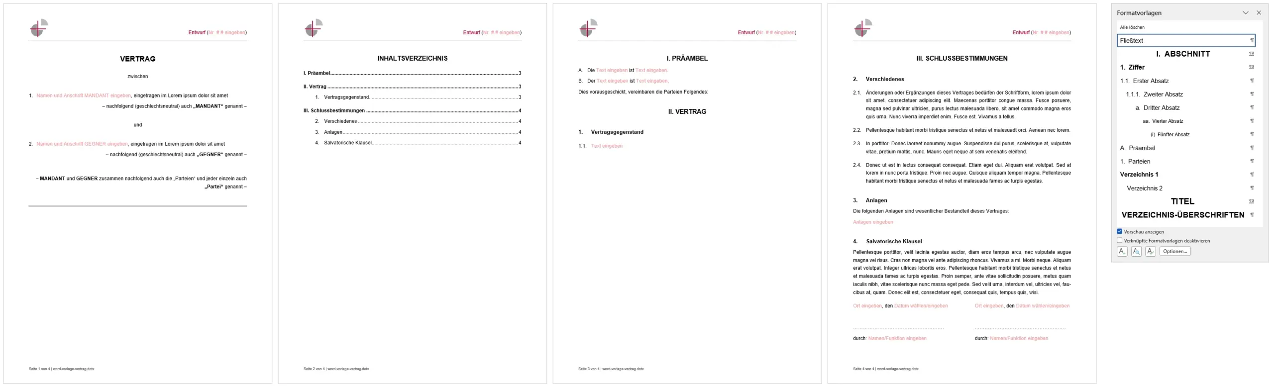 Zur Veranschaulichung habe ich ein anonymisiertes Beispiel einer von mir erstellten Word-Vertrags-Vorlage für eine Anwaltskanzlei vorbereitet, an dem ich die Vorgehensweise zeige.